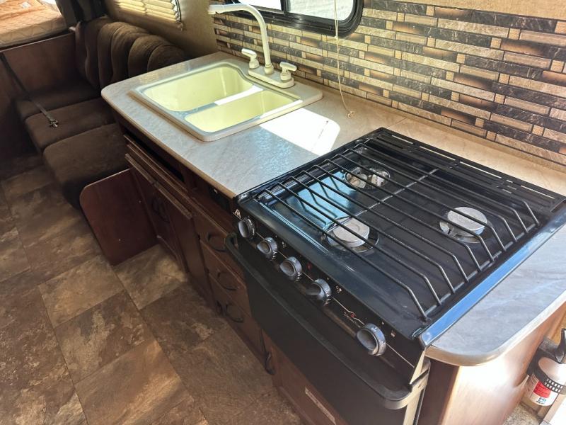 Along one slide there is a refrigerator, wardrobe/TV shelf, and dinette. The other side offers a sofa, double kitchen sink, three burner range, and microwave.