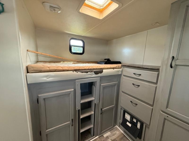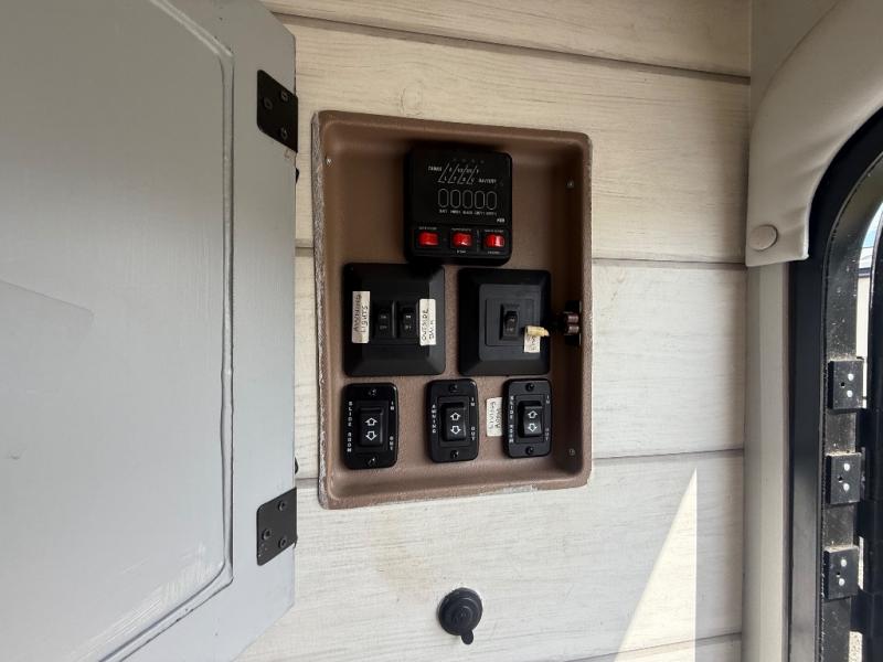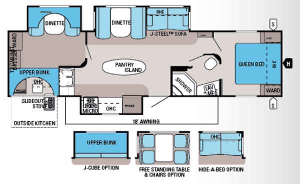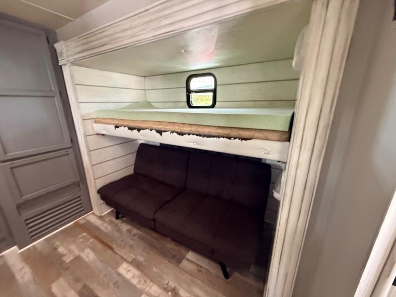 In the rear, you will find the bunk house. Your kids will enjoy their own space. There is a dinette slide with a bunk above the dinette on one side and an upper bunk on the other side. There is additional storage space with the wardrobe, dresser, and tv cabinet.