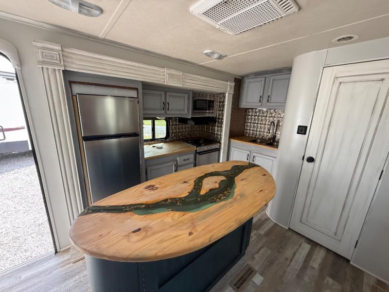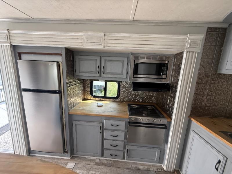 As you enter this travel trailer, you will be in the kitchen area. To your left is a slide with a refrigerator, three burner range, and microwave. In the middle of the kitchen is a pantry island. The other slide has a sofa and dinette.