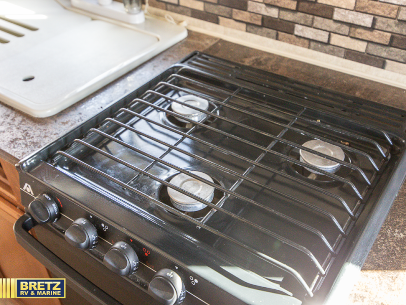 In the kitchen there is a refrigerator, pantry, double kitchen sink, three burner range, and microwave.