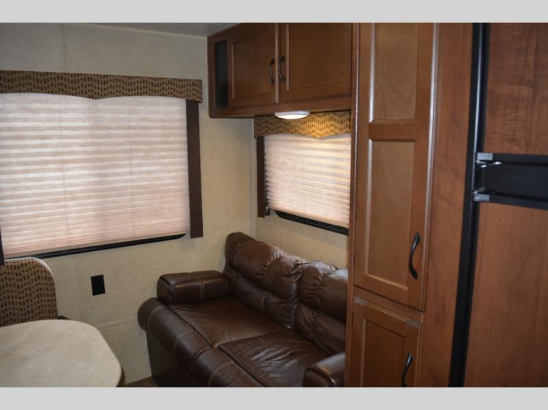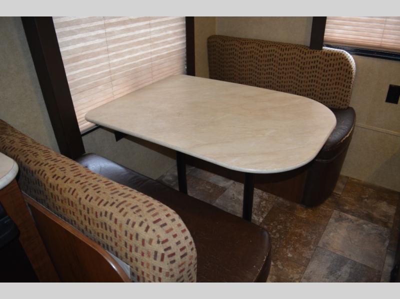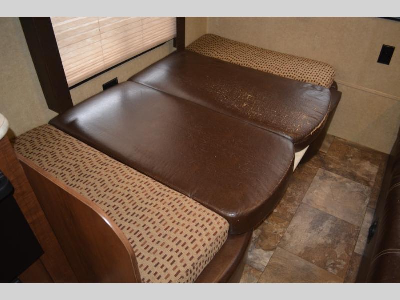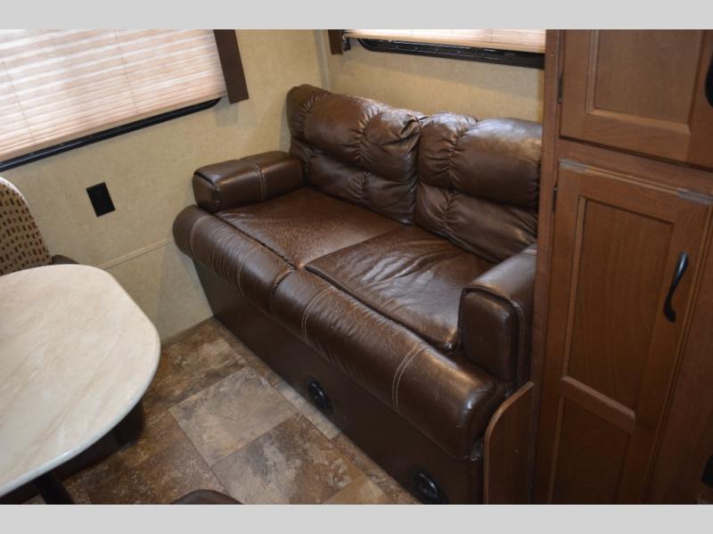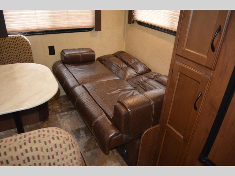 In the rear of the travel trailer you will find a sofa and a dinette.