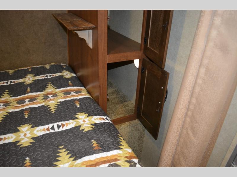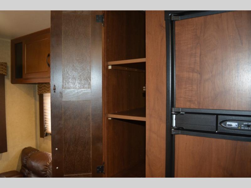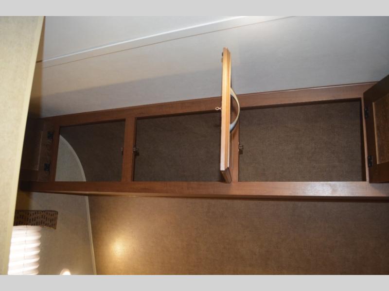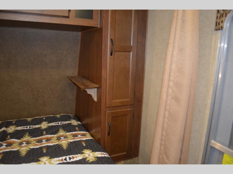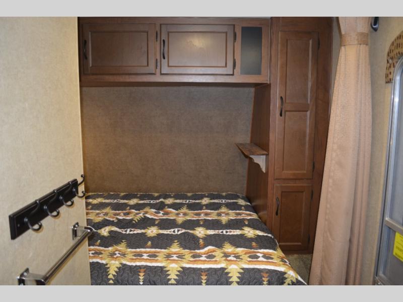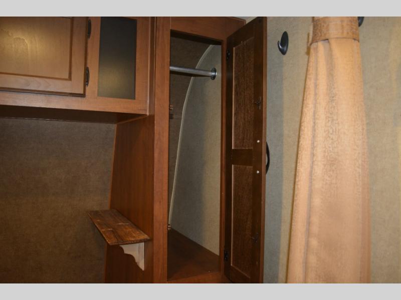 Inside this travel trailer, you will find a queen bed and wardrobe to the right.