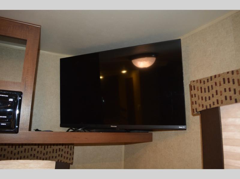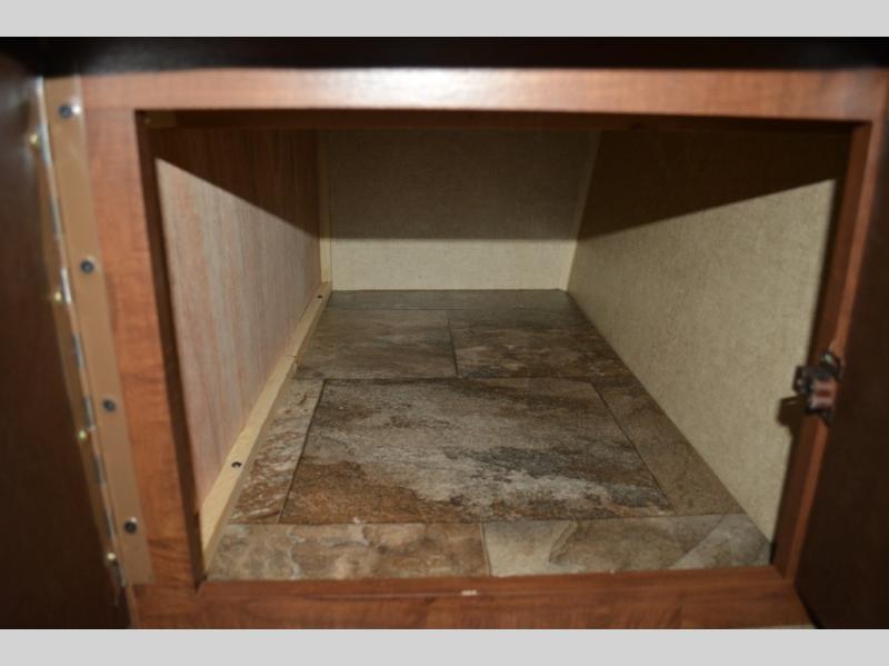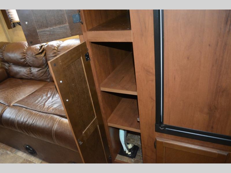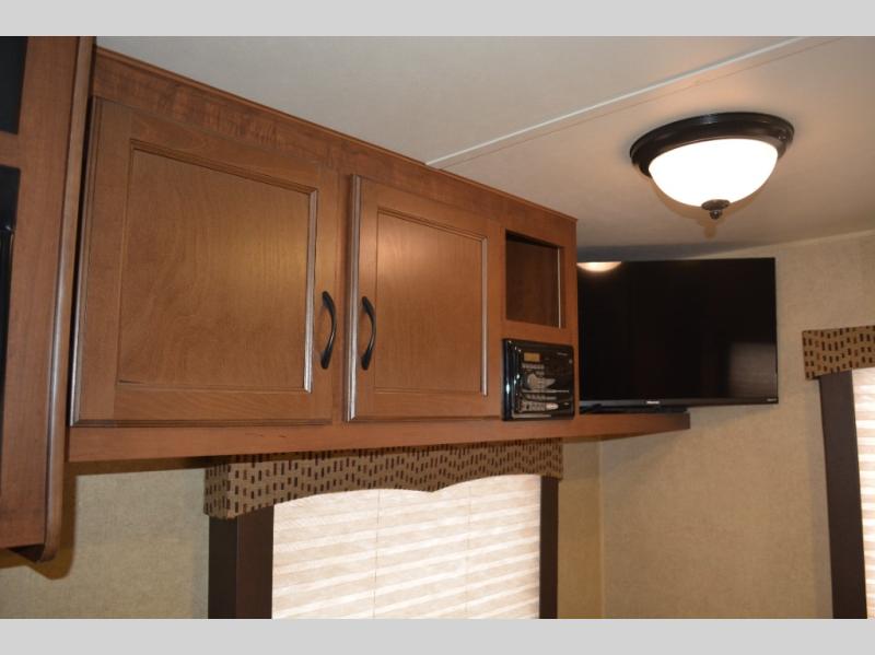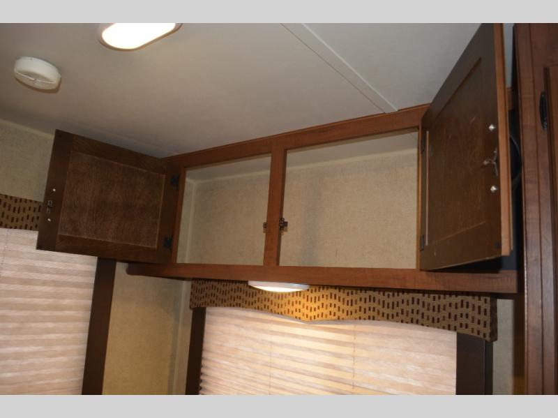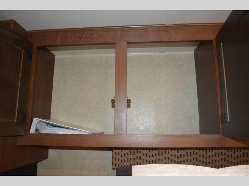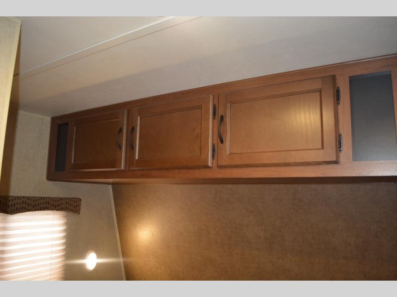 Inside this travel trailer, you will find a queen bed and wardrobe to the right.