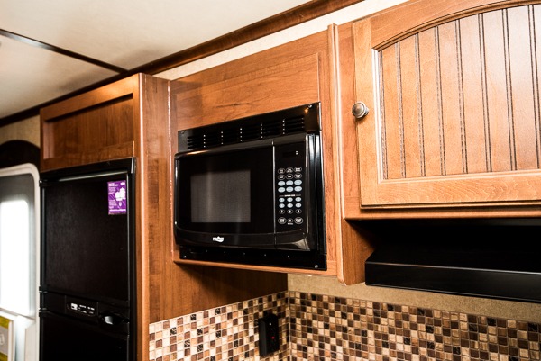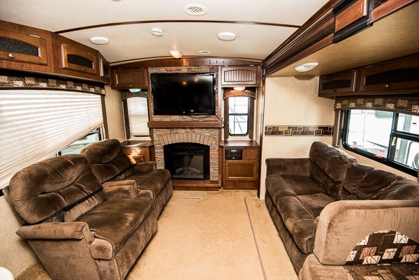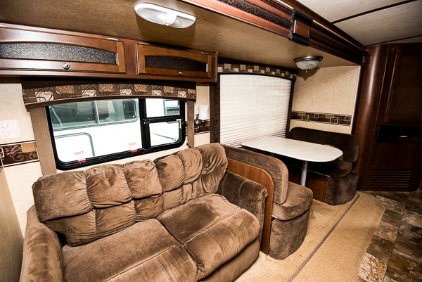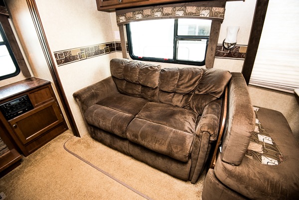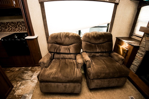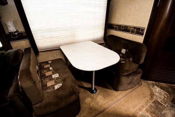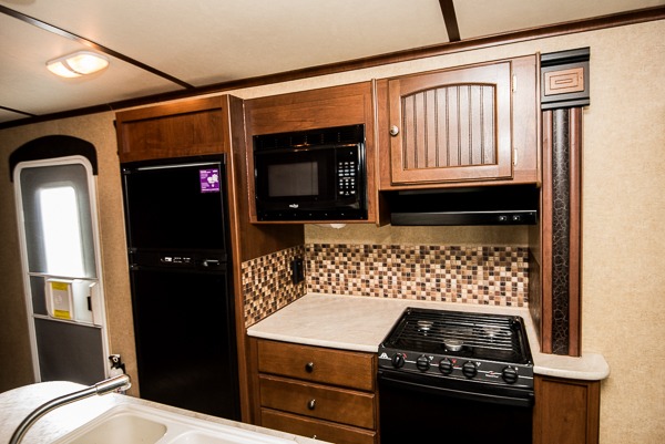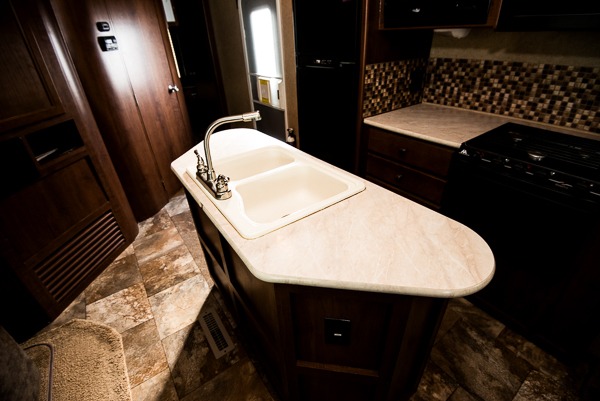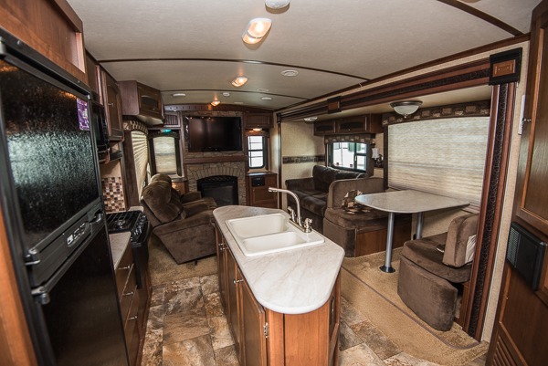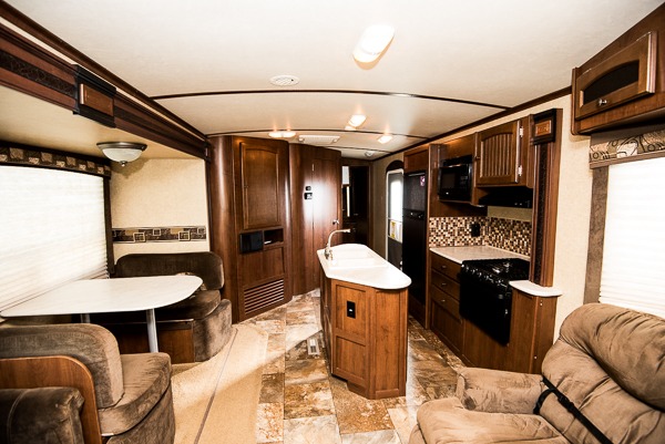 As you enter the travel trailer, to the left is a slide with a refrigerator, microwave, and three burner range. The kitchen island has a double kitchen sink. In the corner you will find a large corner pantry. The opposite side has a slide with a dinette and sofa. Along the rear wall is an entertainment center. You can also enjoy relaxing in the two lounge chairs.