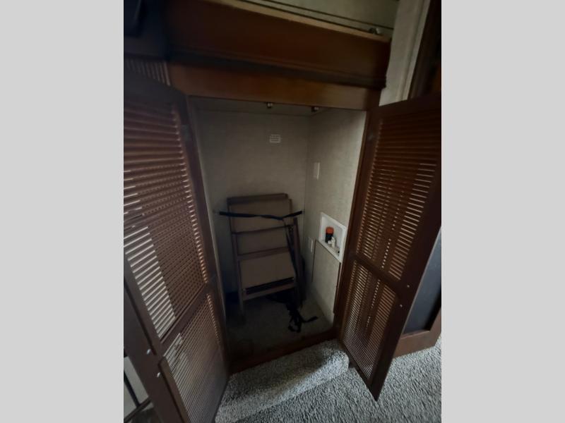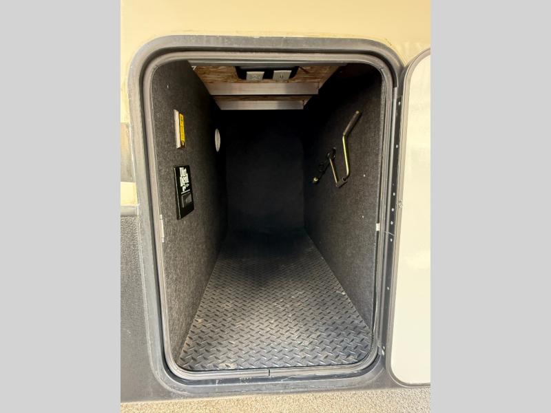 The bedroom features a king bed slide, and a large wardrobe and closet slide with washer/dryer option on one end that is accessible from the hall before entering the bedroom.