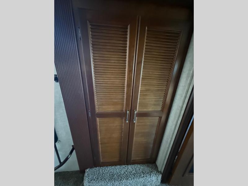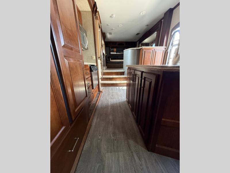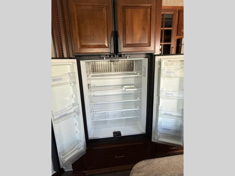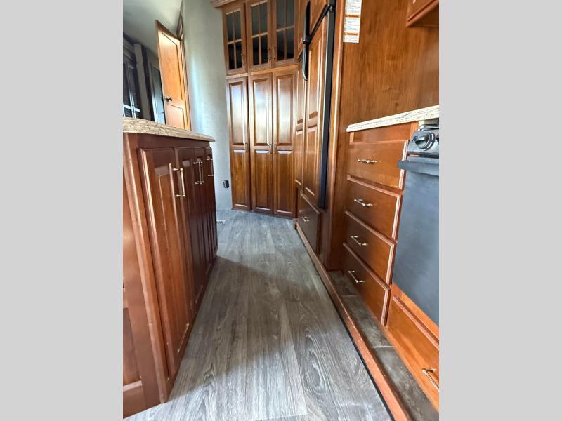 Step inside and find yourself in a kitchen that is as spacious as home. There is a free standing dinette slide to the left of the door, a large kitchen island with double sink, and a second slide featuring a double door refrigerator and three burner range. Plus, there is a pantry off to the side, and overhead cabinets throughout for dishes and things.