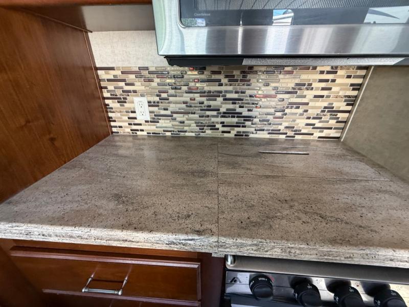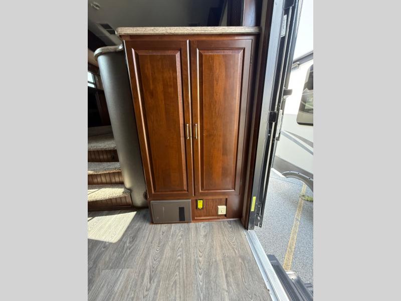 Head up the steps to your right from the kitchen to a front living space also featuring dual slides. There is an entertainment center slide, and a sofa slide opposite. Plus a large hide-a-bed sofa sleeper along the front wall. The perfect place to entertain, relax, and provide sleeping space for extra guests if needed.