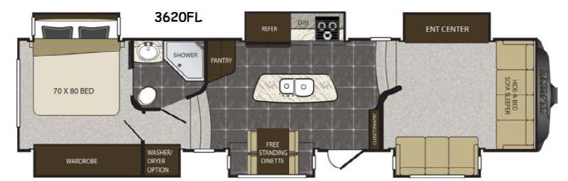 You will be absolutely amazed at the space inside this Alpine fifth wheel by Keystone RV featuring SIX slides! That's right, SIX! Model 3620FL with it's front living room layout provides maximum space in every area of this unit.