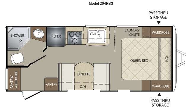 The very front of 204RBS features a comfy queen bed with wardrobes on both sides of the bed. There is an overhead cabinet and a laundry chute, plus front pass-through storage, and so much more!