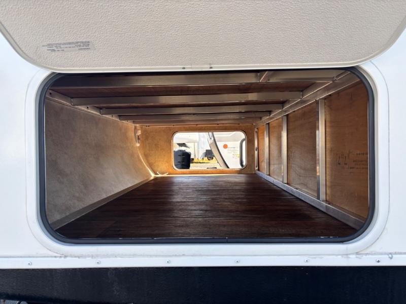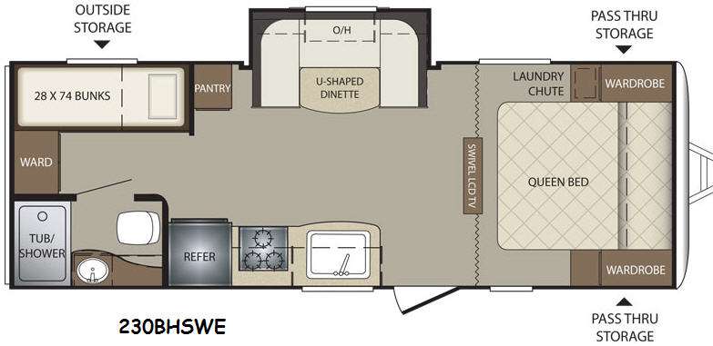 As you enter model 230BHS you will see a front bedroom with queen bed to your right. There are dual wardrobes for clothes and things on both sides of the bed. Plus you will enjoy the convenient laundry chute and front pass-through storage compartment also.