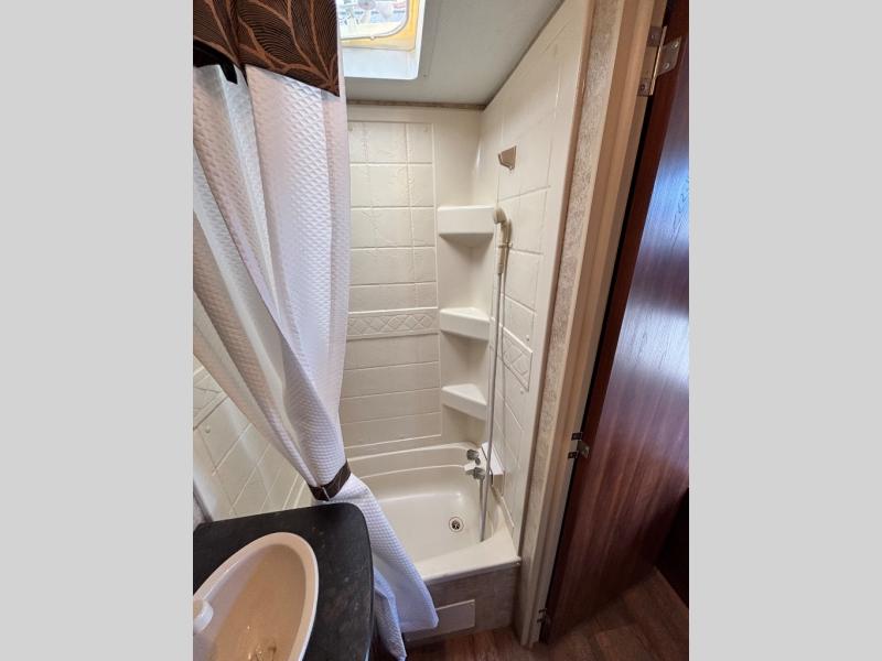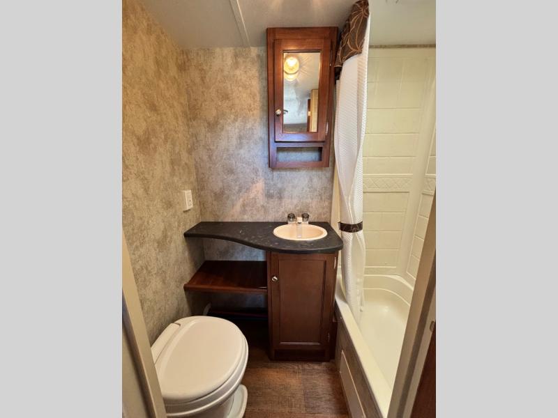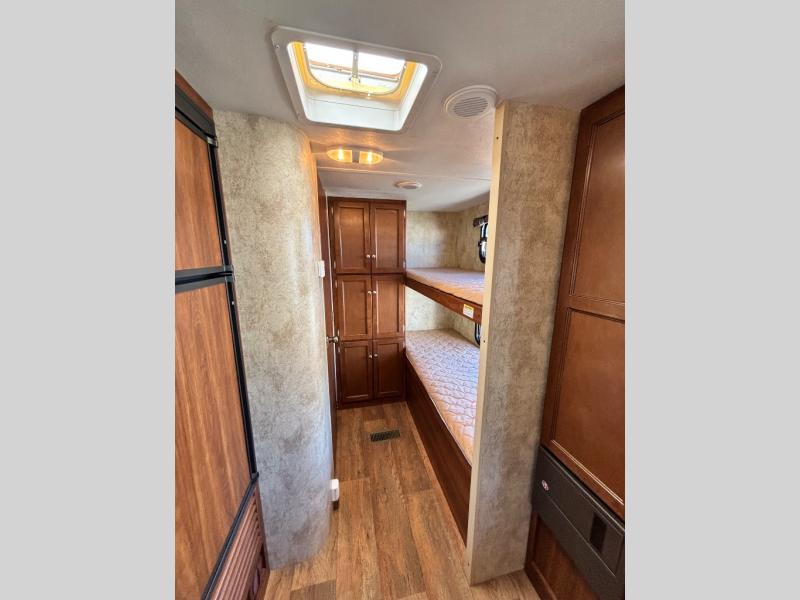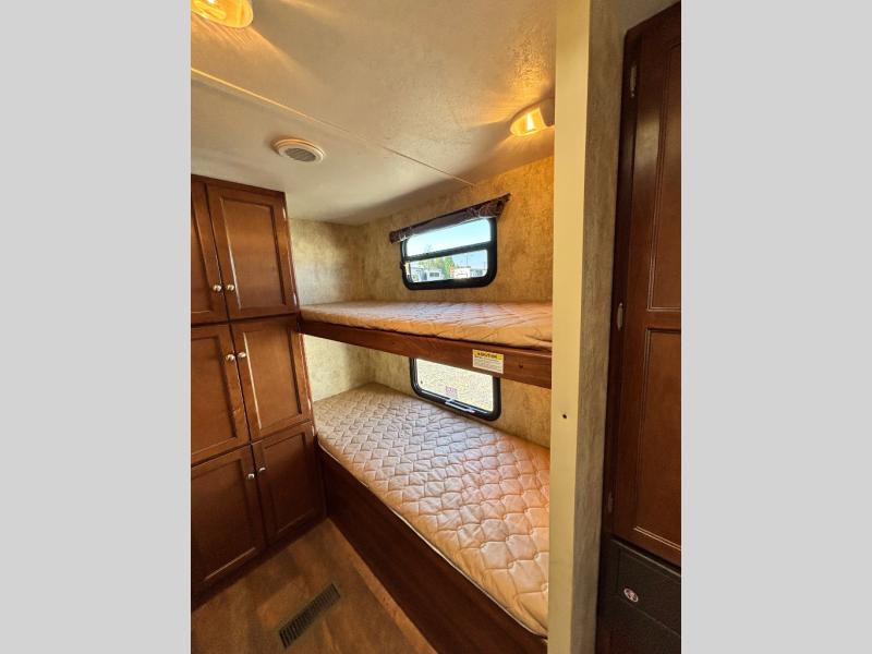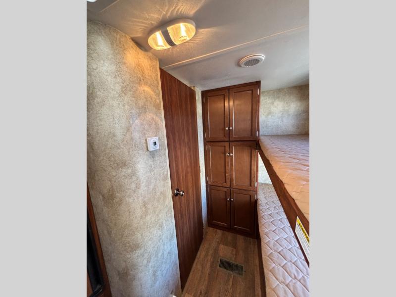 In the rear of the unit you will find a set of bunks on the right with a wardrobe for storage. Next door on the left side there is a convenient full bath featuring a tub/shower, toilet, and vanity with sink, plus so much more!