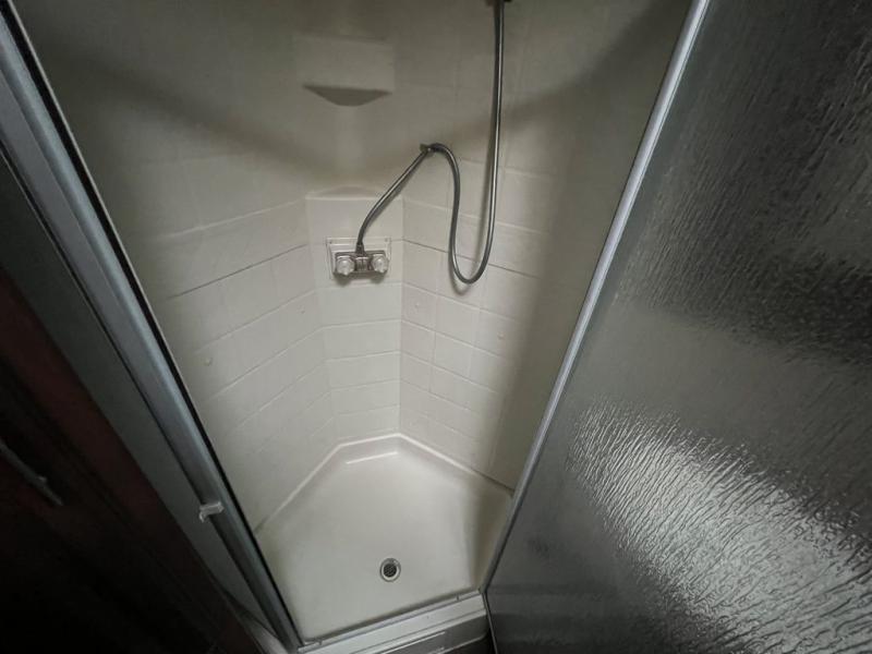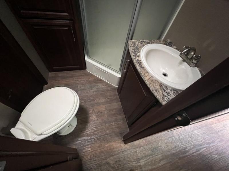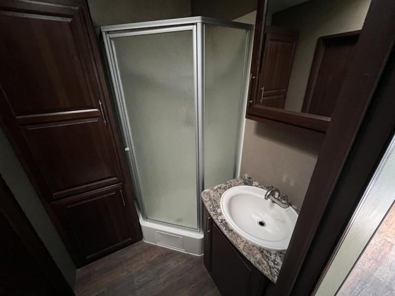 Move to the rear of this fifth wheel and find a full bath with toilet, sink, neo-angle shower, and linen cabinet.