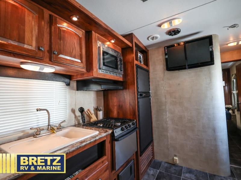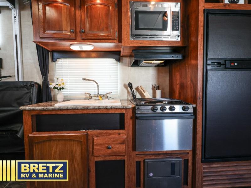 The kitchen area has everything you need to make up meals and snacks for the whole gang while you travel. It includes a refrigerator, three burner range, and double kitchen sink for easy cleanup. There is an overhead storage cabinet above the sink and a pantry near the side entry door for more storage also.