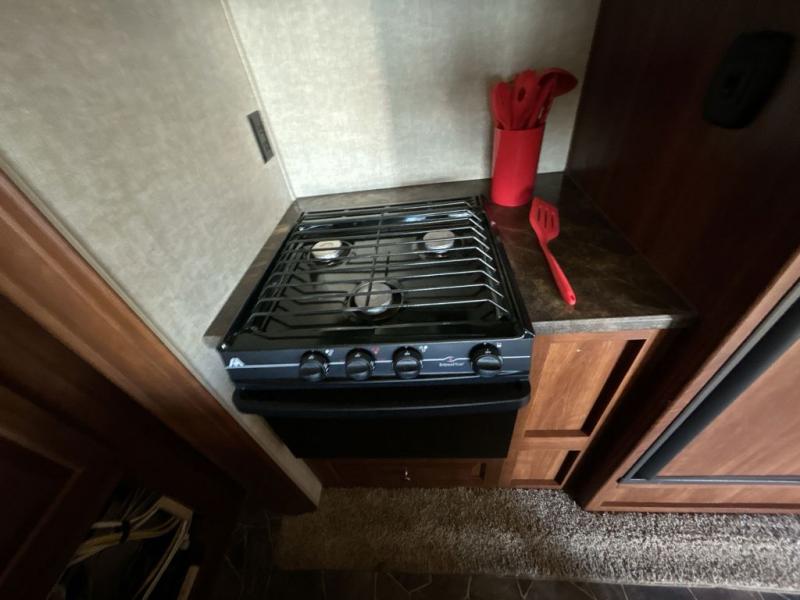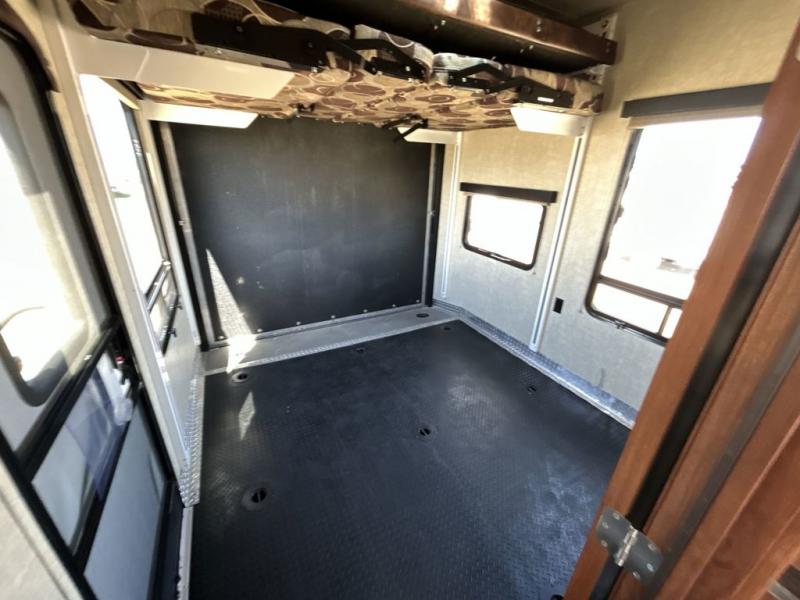 Once you reach your destination and the toys are removed this space quickly becomes an extension of the travel trailer by providing extra sleeping space and a place to hang out during the day. There are dual sofas opposite one another with a top queen bed that raises up to the ceiling when not in use.