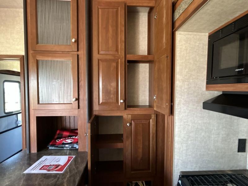 Throughout this Fuzion 303 you will find many storage compartments in overhead cabinets, lower cabinetry in the kitchen area, plus front exterior storage too.