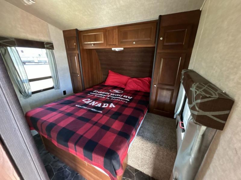 The very front of the unit features a private bedroom with residential queen bed and wardrobes on both sides of the bed for storing your things. There is also an overhead cabinet and TV hook-up if you decide to add a second television.
