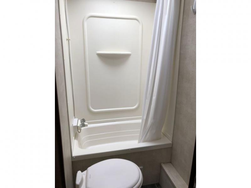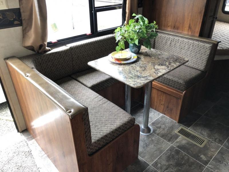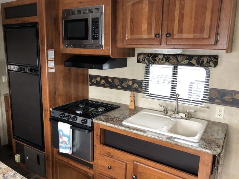 The kitchen area across from the dinette allows you to easily create meals and snacks while you are on the go. Enjoy a handy refrigerator, three burner range, and double kitchen sink, plus a side counter extension, and so much more!