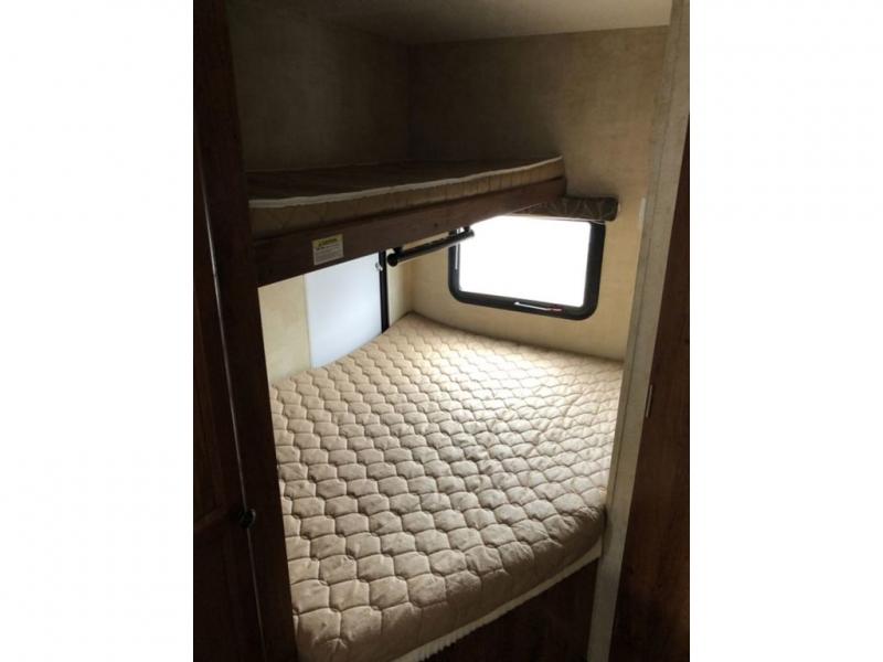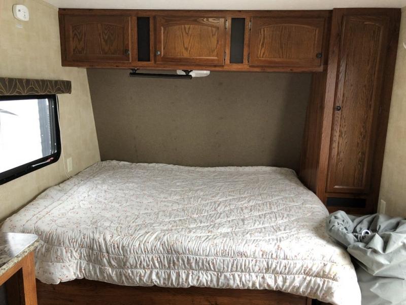 On the inside of this unit you will find a queen bed with storage cabinet nearby and additional overhead space along the entire front wall to the right of the entry. A curtain can be pulled at night for a bit more privacy.