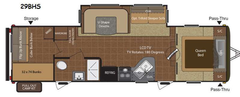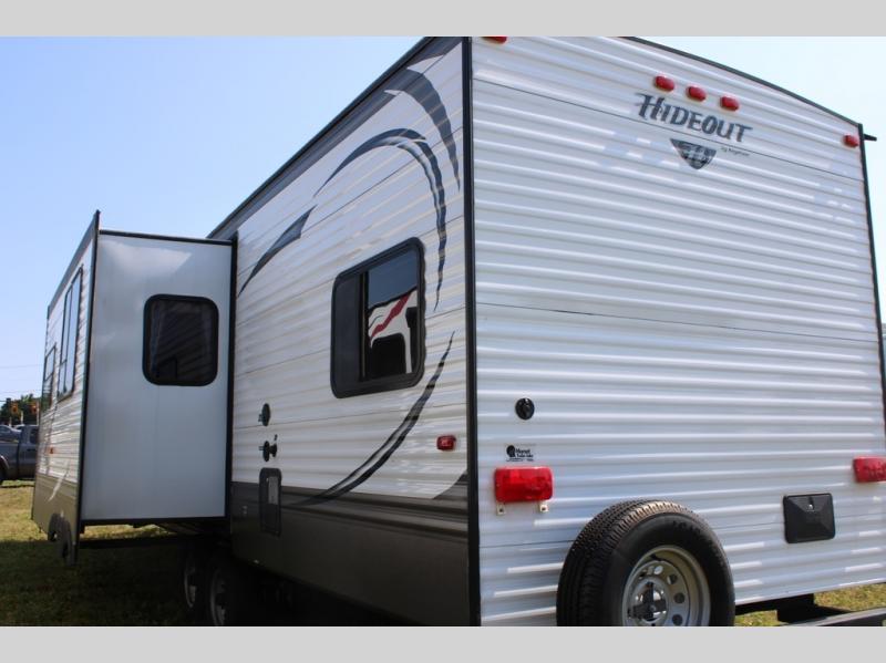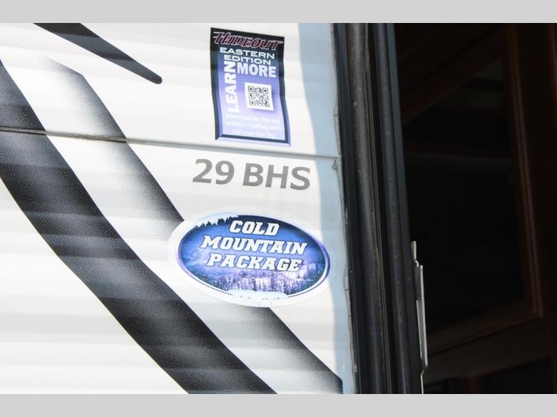This Hideout bunkhouse travel trailer model 29BHS features dual entry doors, a large slide out, an outdoor camp kitchen, plus sleeping for 9!