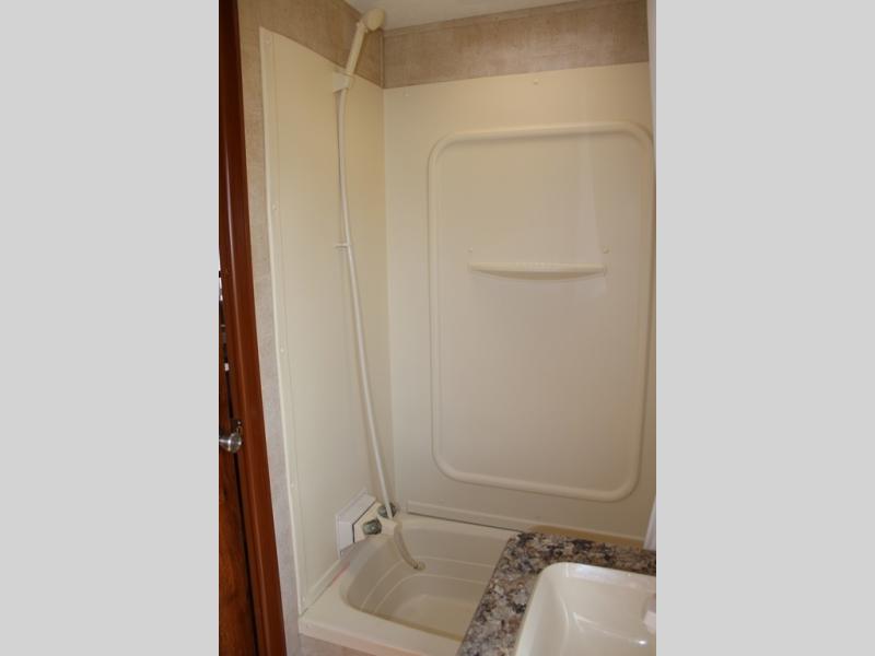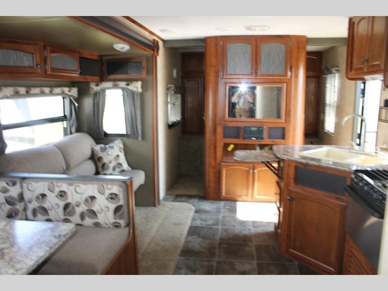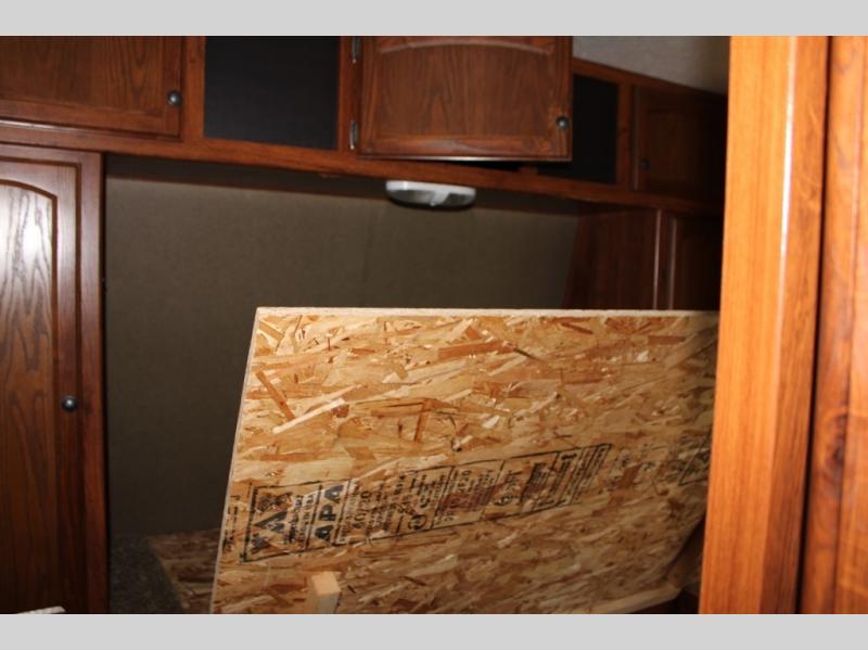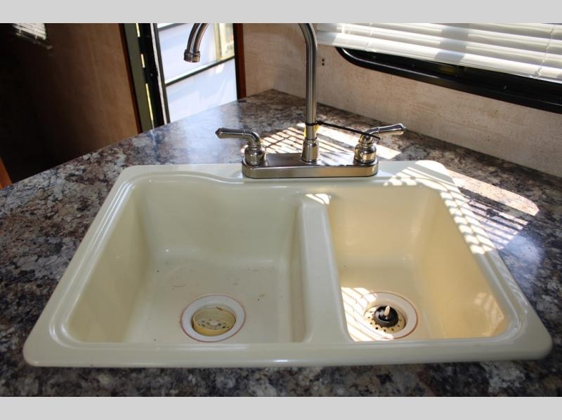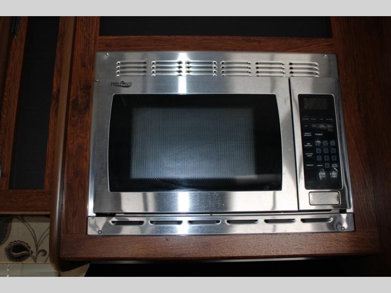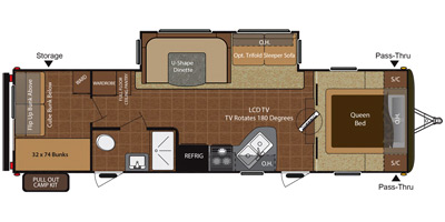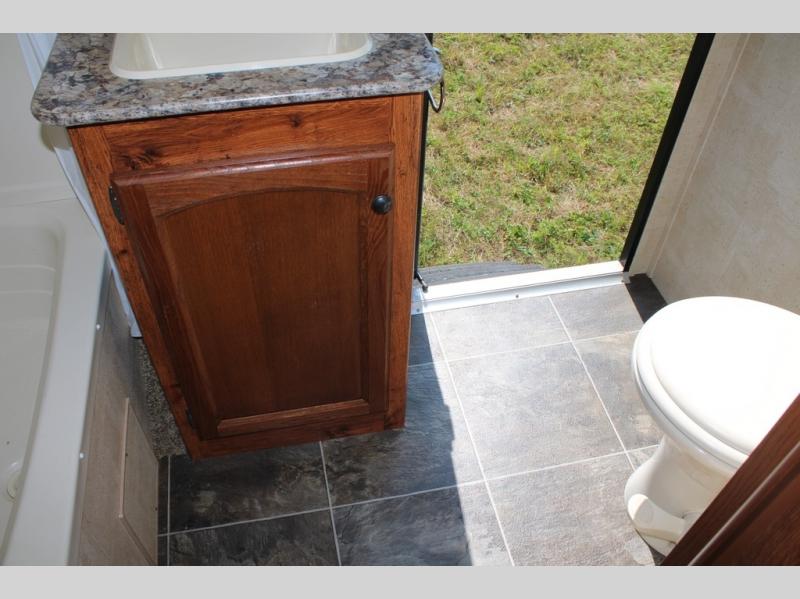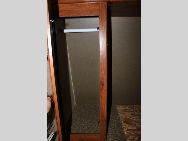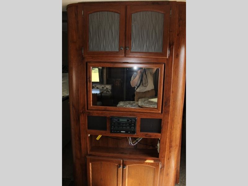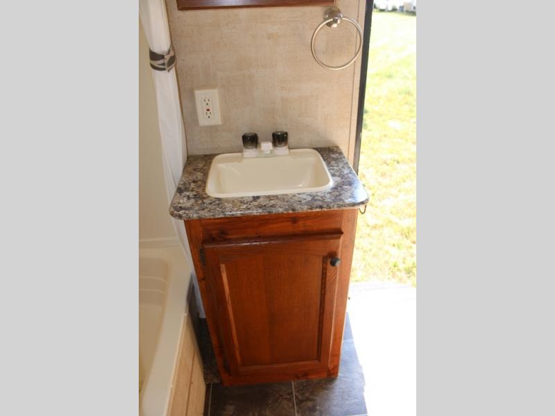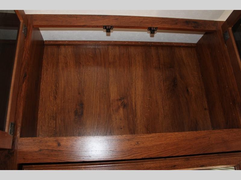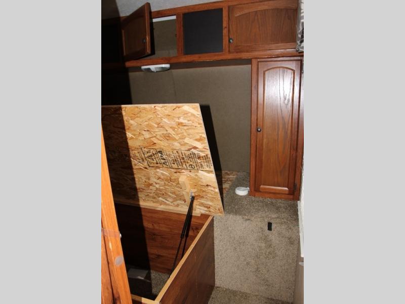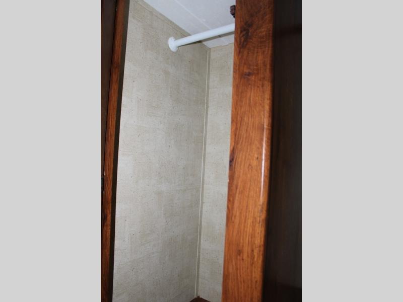 Step inside and see all the conveniences of home. There is a front bedroom with queen size bed including dual shirt closets and overhead storage for all of your things. Sliding pocket doors on either side of the living room entertainment center provide a bit of privacy in the bedroom when shut, and the rotating LCD TV makes it available for watching even after you turn in for the night.