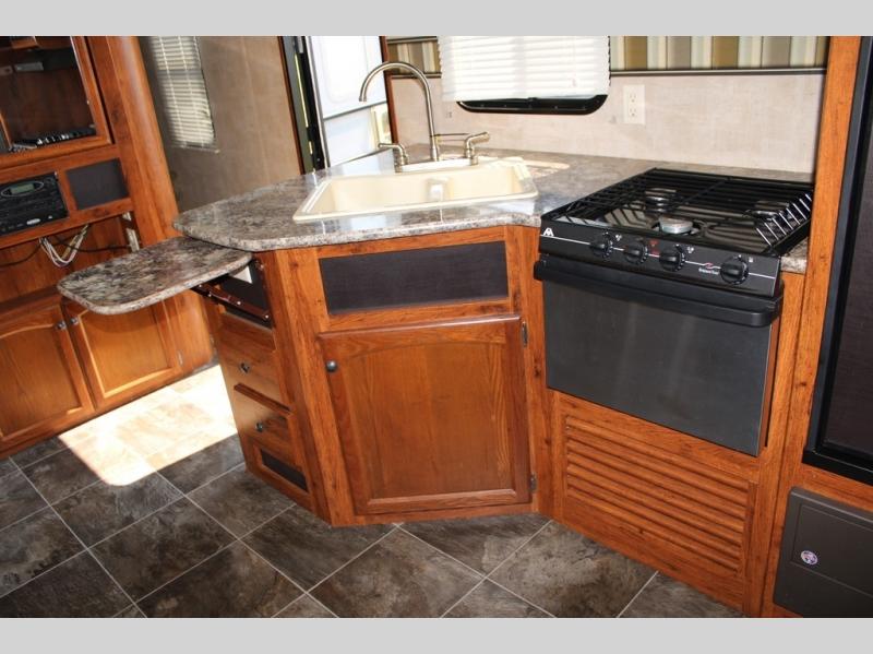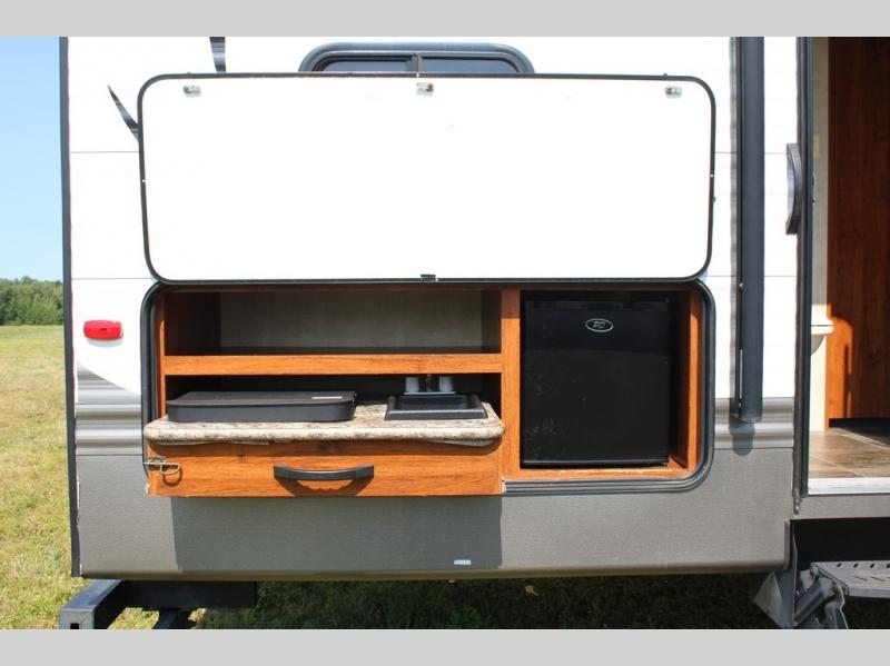 The pull-out camp kitchen is the perfect feature for those who enjoy cooking and dining outside. There is a refrigerator, overhead cabinet space, counter area, and a slide out stove top, plus so much more!