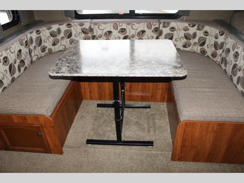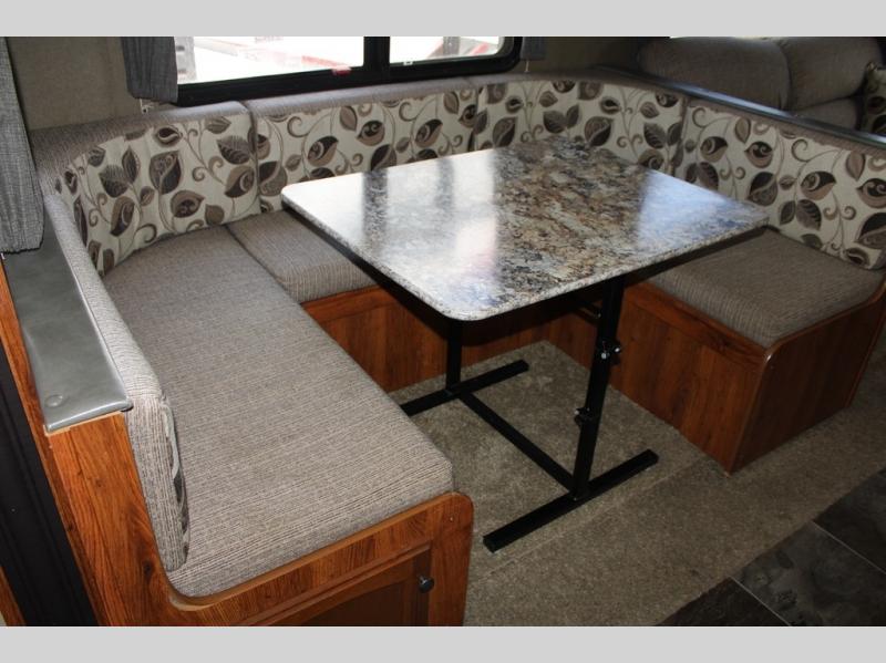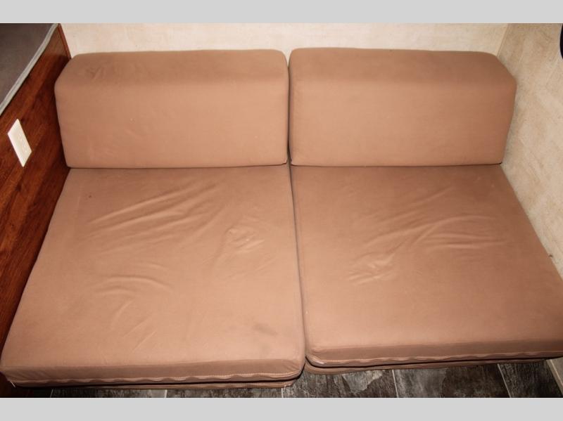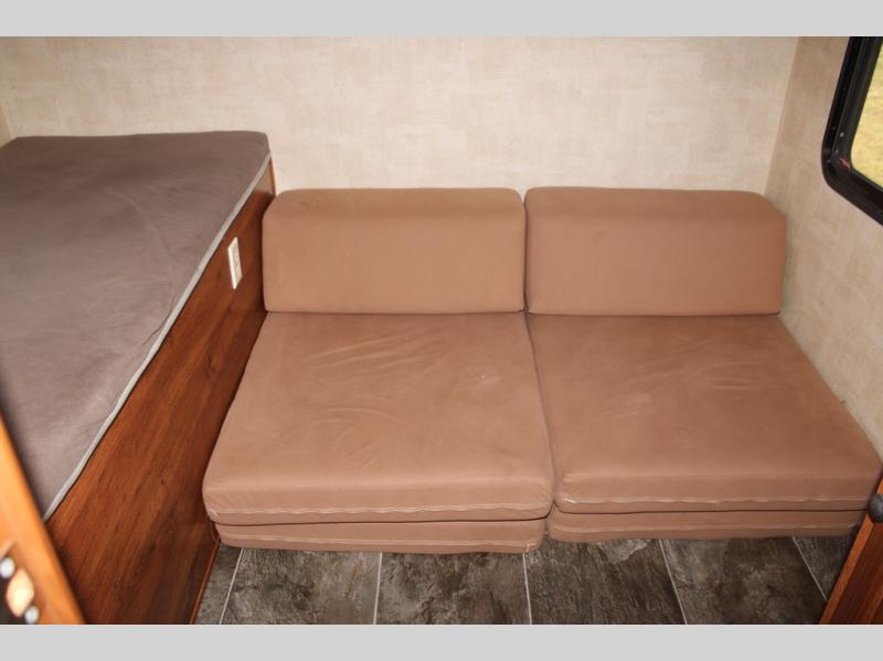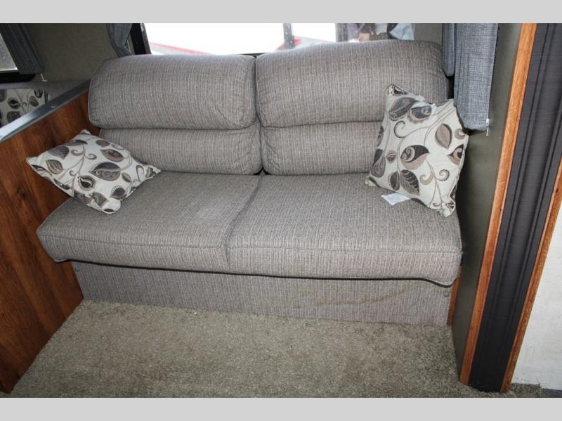 The living area features a large slide out u-shaped dinette and sofa with overhead storage. You can choose a tri-fold sleeper sofa for added convenience at night.