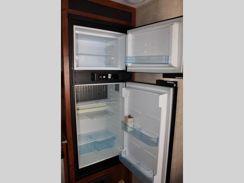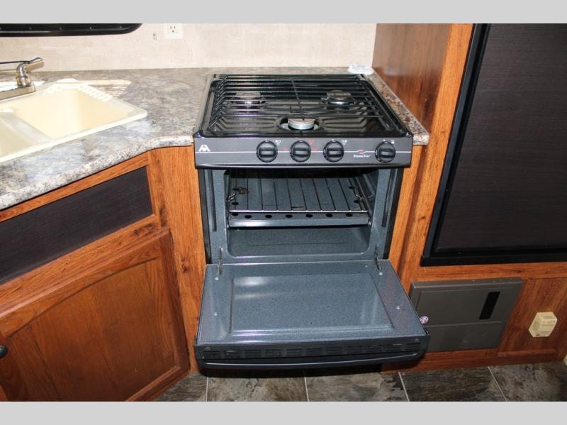 The Hideout kitchen provides everything you need to prepare and cook meals and snacks while you are away. There is a three burner range, refrigerator for perishable items, and overhead storage. You will also find a convenient floor to ceiling pantry next to the dinette for dry goods, canned items, and more.