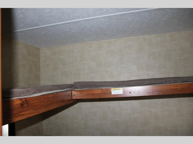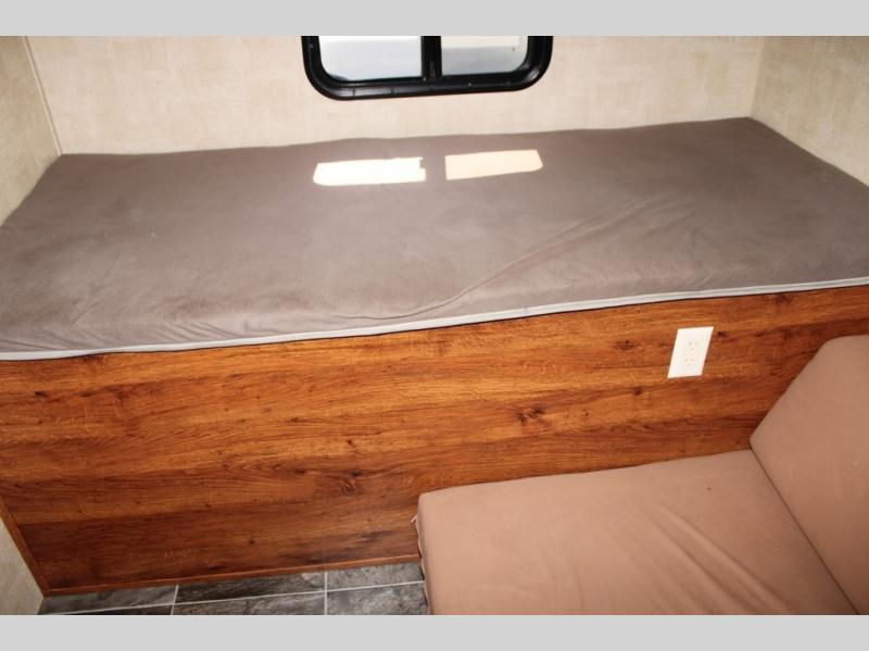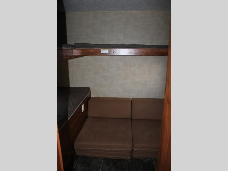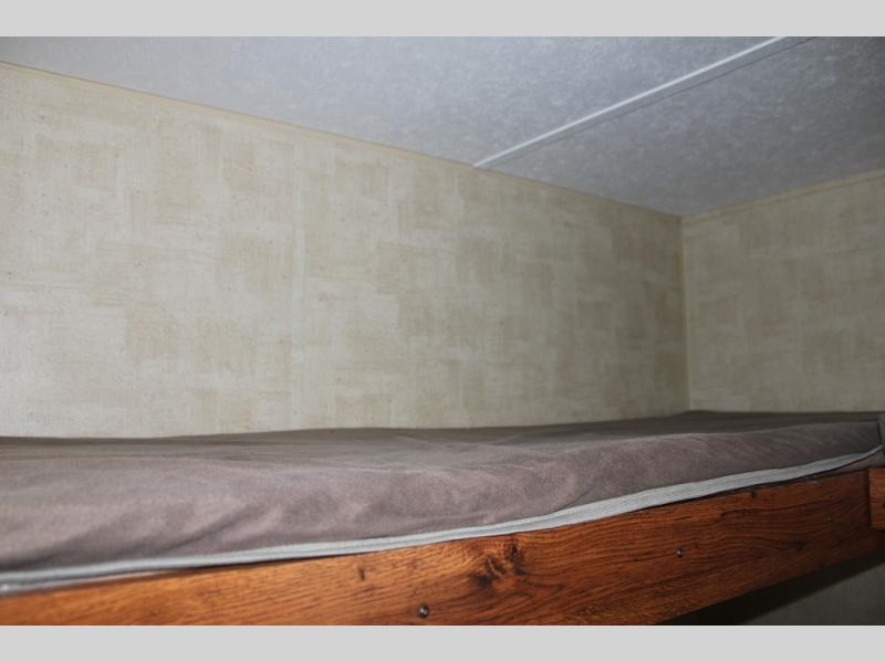 The front bunkhouse features a Cube bunk below a flip-up bunk along the rear back wall. A second set of bunk beds 32” x 74” are along the side bunkhouse wall.