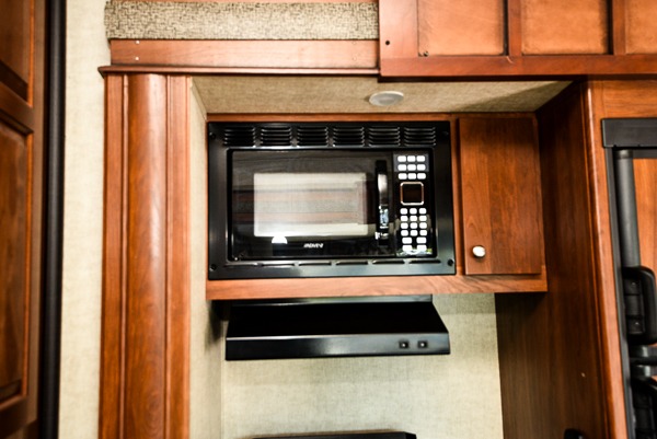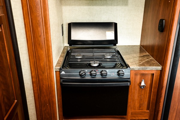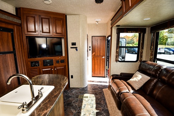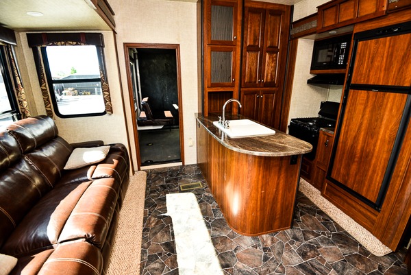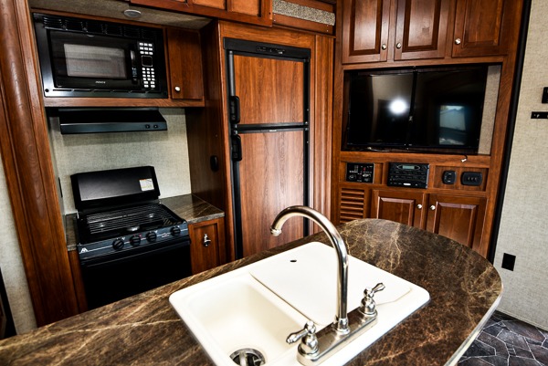 The living and kitchen area are combined and feature a large slide-out sofa with dinette table perfect for mealtime or hanging out. There is a peninsula with counter space and double sinks and pantry. There is also slide-out three burner range and 8 cu. ft. refrigerator.