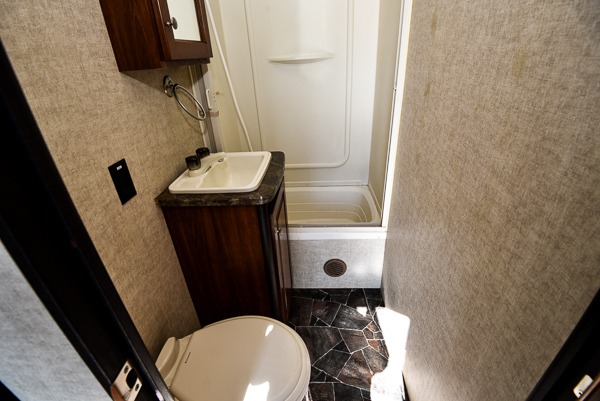 Moving toward the front you will find a side aisle bath on the left with tub/shower, toilet, and sink.