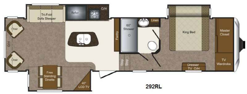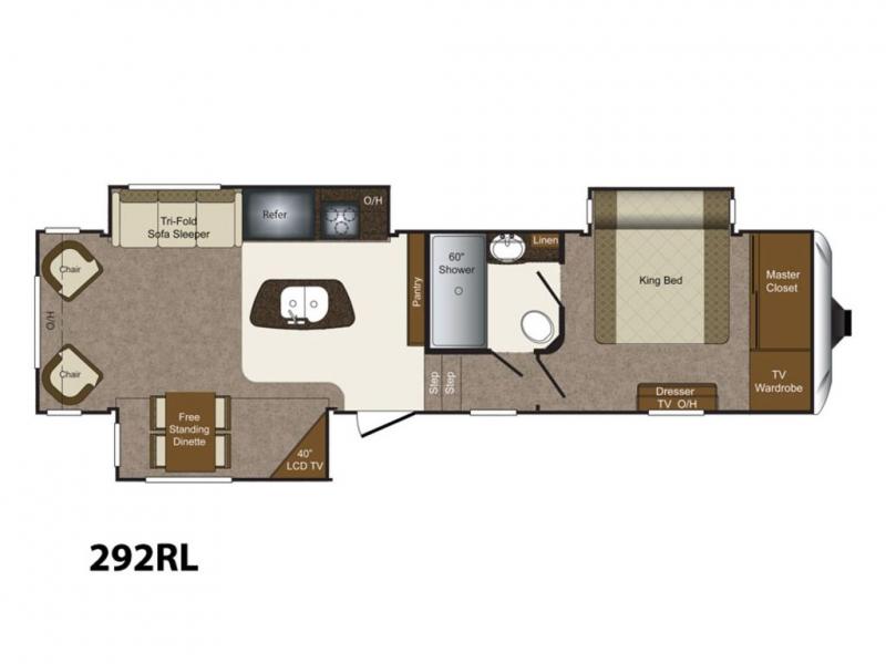 Model 292RL features a rear living layout, triple slides, a kitchen island, and a Queen size bed