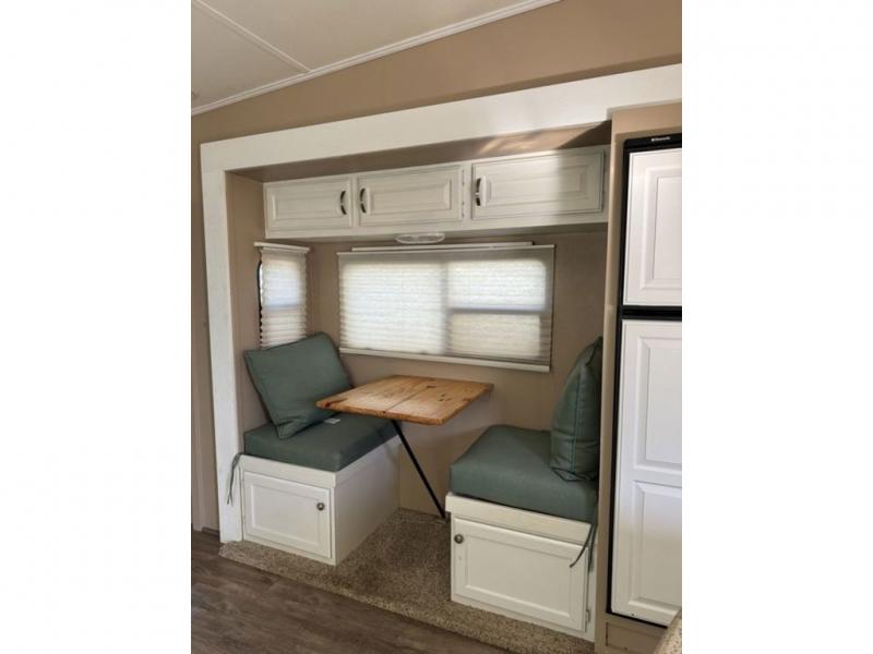 The second slide features built in dinette with ample storage underneath seating, refrigerator and