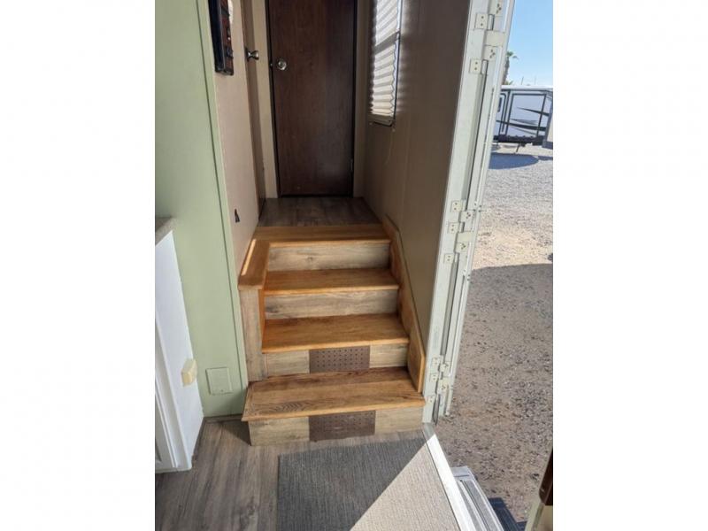 The rear wall features custom built overhead storage cabinets the entire width of the fifth wheel.