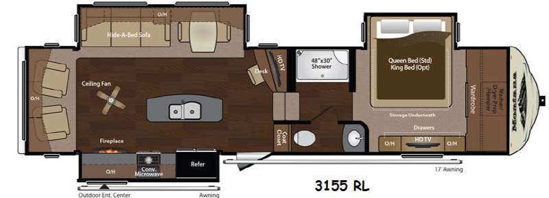 This Keystone Montana fifth wheel model 3155RL makes it easy to enjoy every camping trip to the fullest! Enjoy triple slides, a rear living layout, convenient kitchen island, and a cozy optional fireplace. There is even an outdoor entertainment center, now how cool is that!
