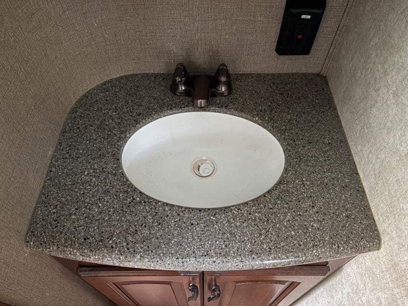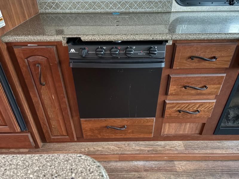 Step inside and be amazed at the spaciousness inside with dual opposing slides in the combined living and kitchen area. There is a slide-out refrigerator, three burner range with convection microwave oven above, and counter space, plus overhead storage. There is even an optional fireplace available below the counter-top, plus overhead storage cabinets also. A convenient kitchen island offers additional prep space, plus it is the location of a double sink, and more storage with cupboards and drawers.