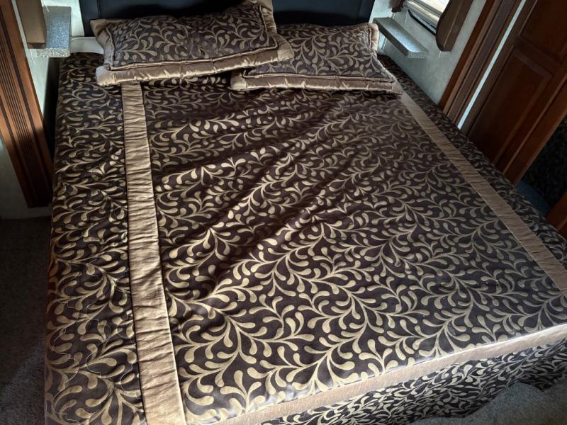 The front bath features a slide-out queen size, or optional king bed with storage underneath. There is a large area of drawers opposite the bed with an HD TV above plus overhead cabinets on either side. The front features a large wardrobe with a washer and dryer prepped space in the center, plus plenty of space for hanging clothes.