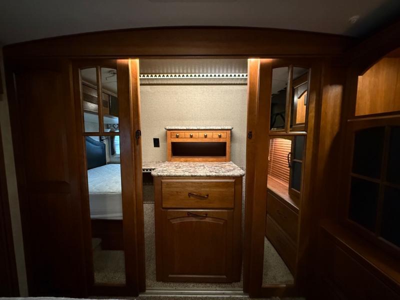 The front private bedroom features a quiet retreat and provides a queen bed slide, or optional king. The bed has ample storage beneath it. The front wall wardrobe features sliding doors and a hamper inside. There is also a bank of drawers opposite the bed with overhead cabinets on either side plus an HD TV overhead, and so much more!