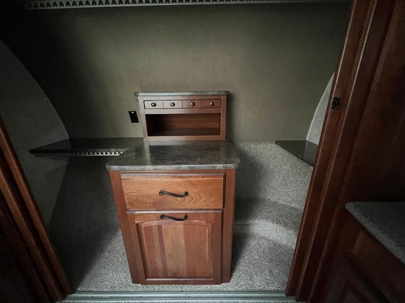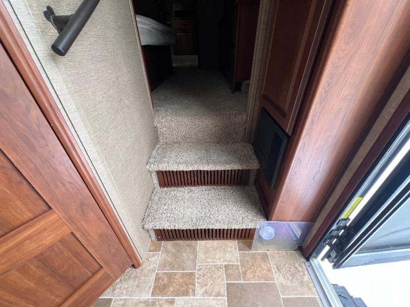 Head up the steps to a master bedroom behind a sliding door at the top of the steps. There is a queen bed slide-out, or optional king with storage beneath for larger things likes suitcases and extra blankets. Opposite the bed find a bank of drawers and storage cabinets with an HD TV above the window with more storage on either side.