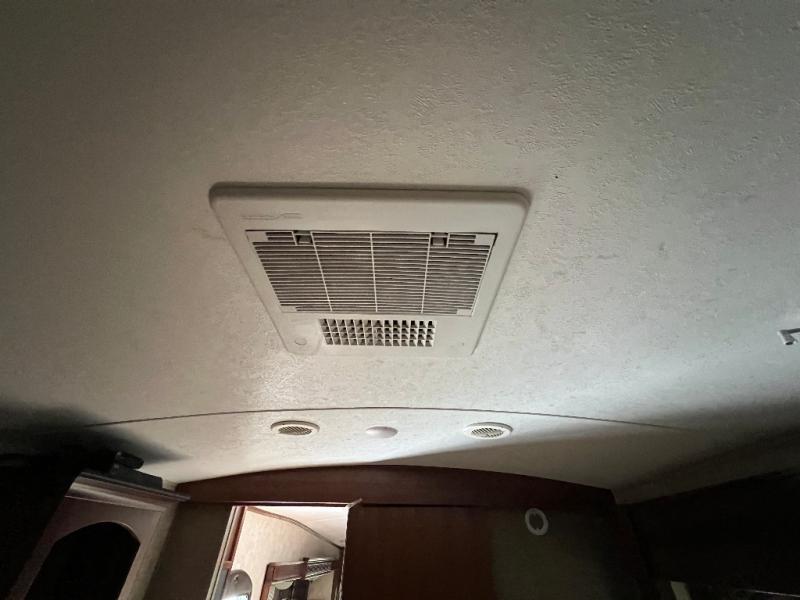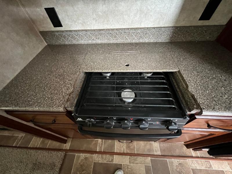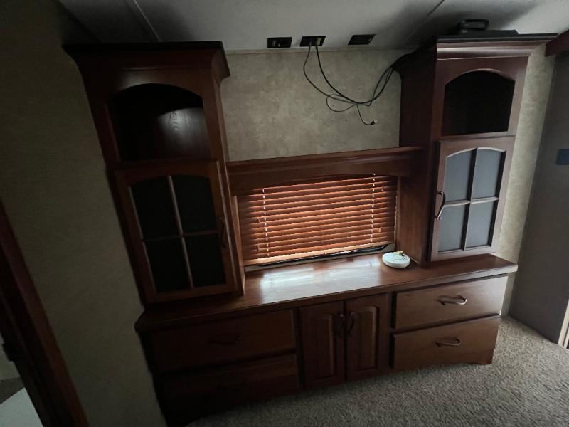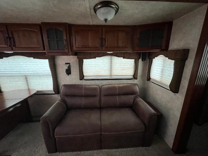 The main living area to the left of the entry door features dual opposing slides and an open concept feel. There is a dining table for two, and two recliners on the left with overhead cabinets the entire width of the slide. Along the rear wall find a hide-a-bed sofa providing plenty of seating and additional sleeping space if needed at night. There is also more overhead storage for your things. An entertainment center can be found in the slide opposite the door with an HD TV, pull-out desk, and optional fireplace if you like.