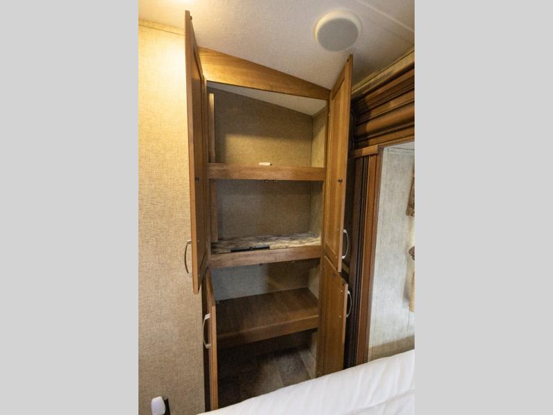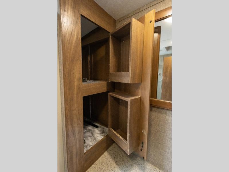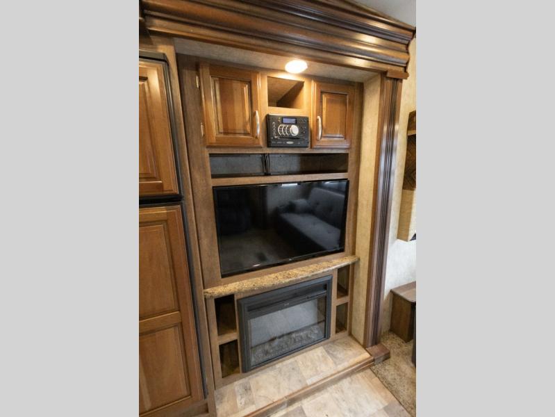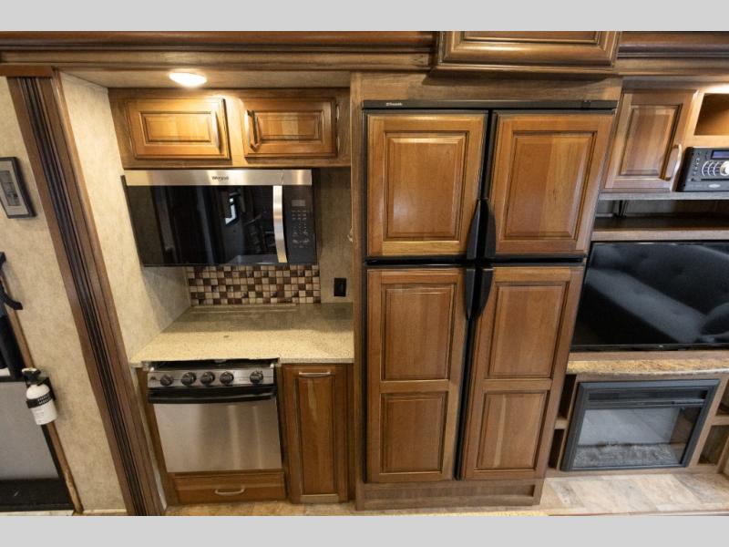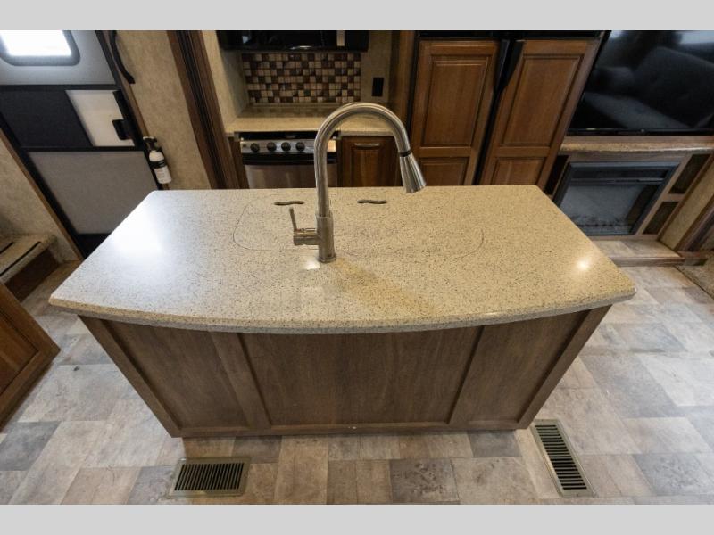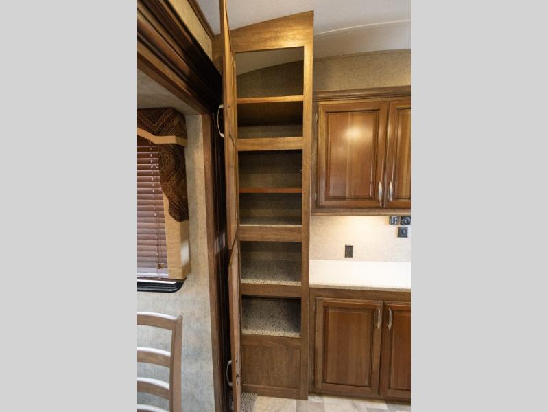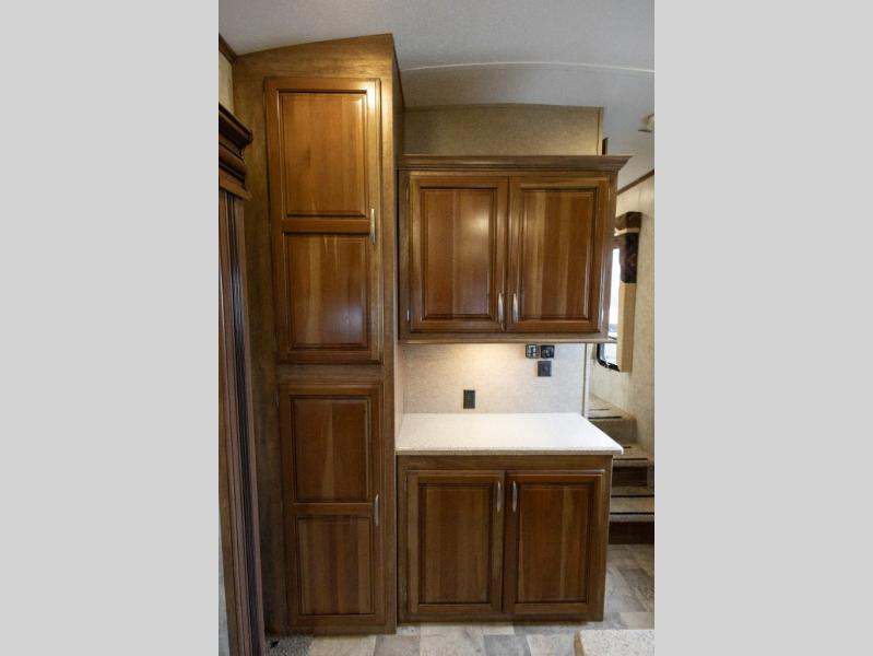 Upon entering 305RL you will see the kitchen amenities to your immediate left with a slide out three burner range, refrigerator, and pantry. There is also a entertainment center within this kitchen slide featuring an HD TV and optional fireplace. The kitchen island features a double sink and provides additional counter space also. Dual pantries are located on the interior wall straight in from the side entry door.
