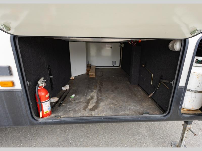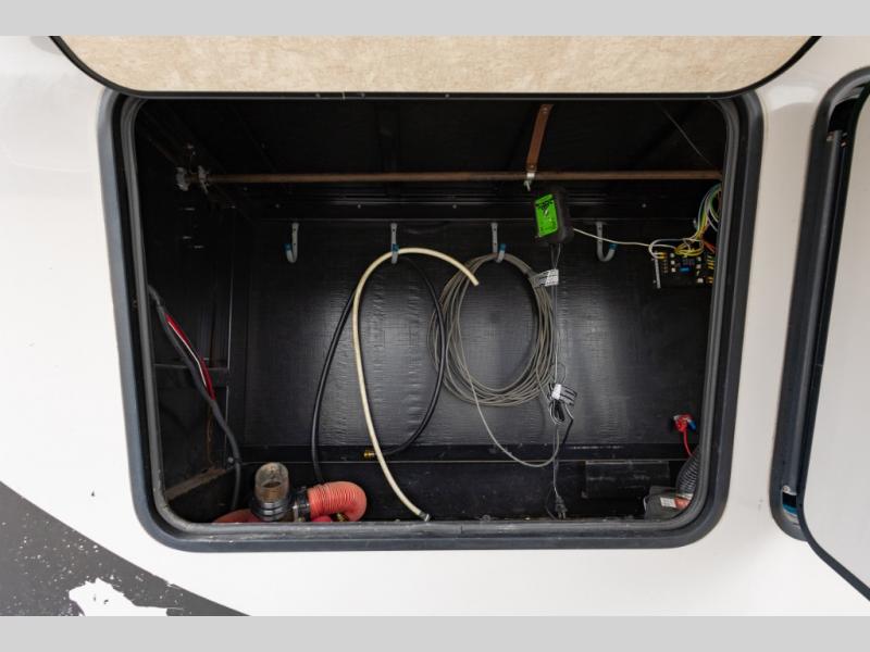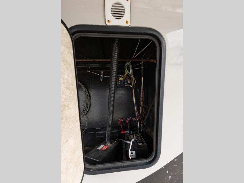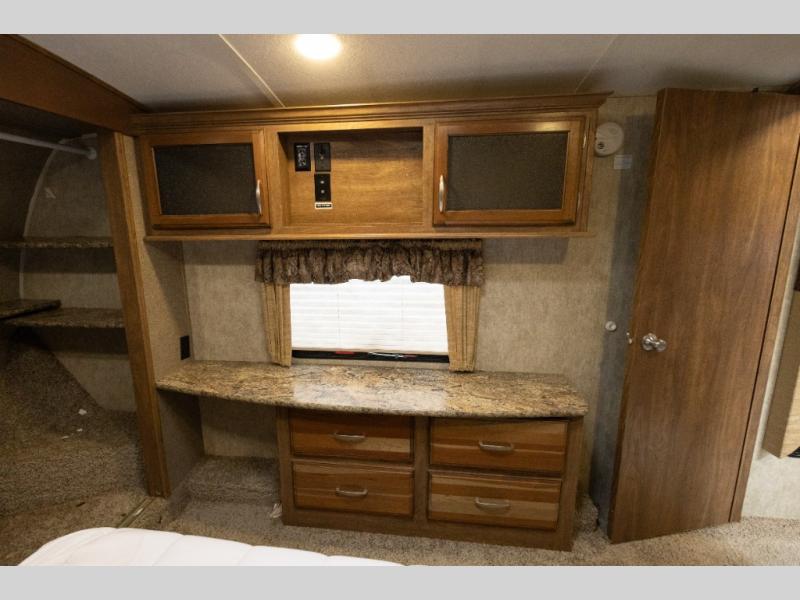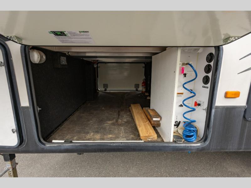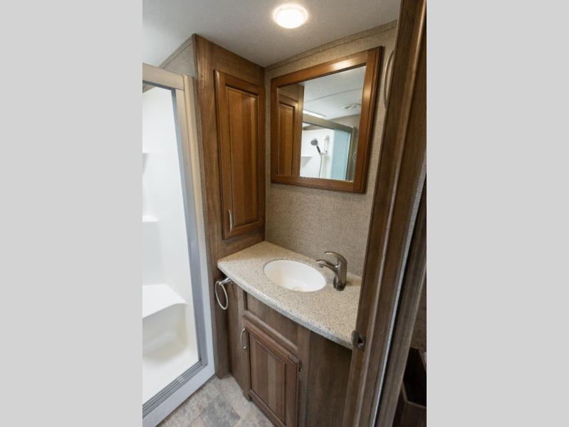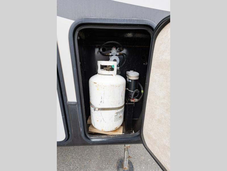 Upon entering 305RL you will see the kitchen amenities to your immediate left with a slide out three burner range, refrigerator, and pantry. There is also a entertainment center within this kitchen slide featuring an HD TV and optional fireplace. The kitchen island features a double sink and provides additional counter space also. Dual pantries are located on the interior wall straight in from the side entry door.
