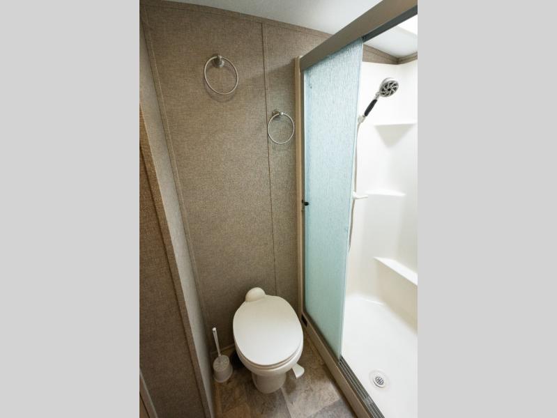 To the right of the entry door step up to a side aisle bath where you will find a 48" x 30" shower, toilet and sink.