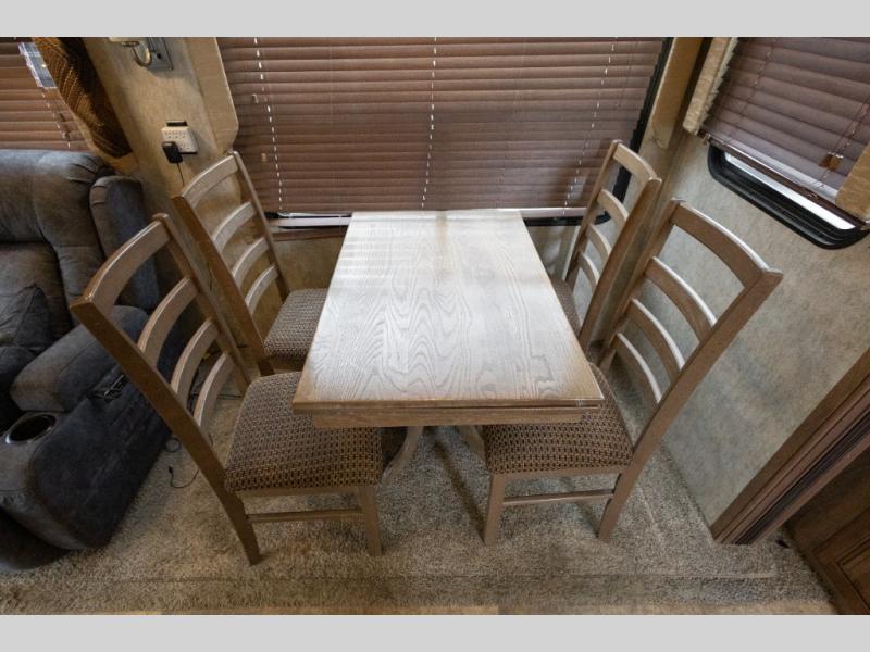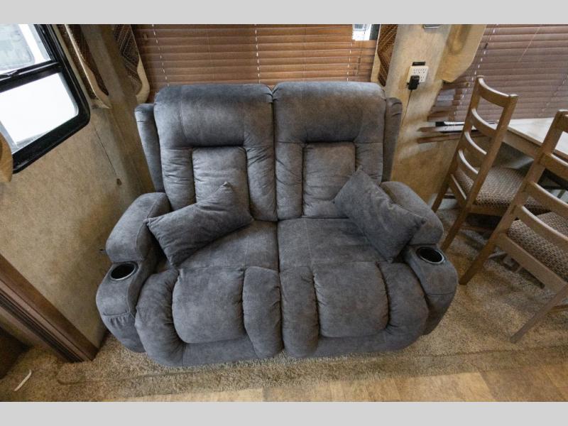 The rear wall features a hide-a-bed sofa with overhead storage. The second slide in the main living area features an optional free standing dinette with four chairs and optional theater seating for two with overhead cabinet and cup holders.