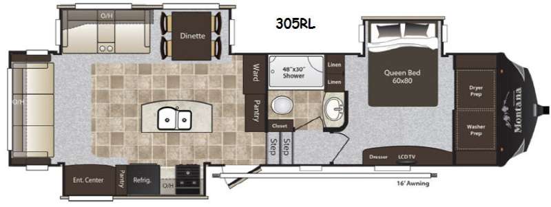 Step into this Montana High Country fifth wheel and see how convenient your time away from home will be. Model 305RL features a rear living layout, triple slides, and a convenient kitchen island, plus more!