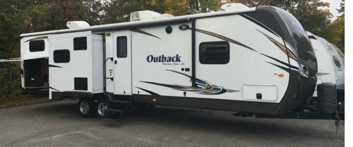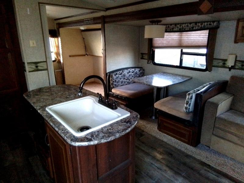 Step inside this Keystone Outback travel trailer model 323BH which offers a spacious interior due to a super large side out. There is a second smaller slide, a convenient kitchen island, and bunkhouse for the kids.