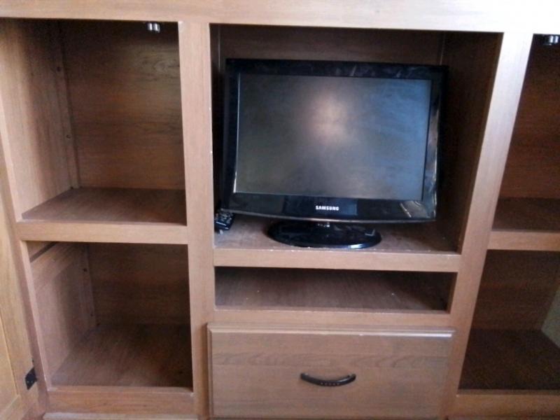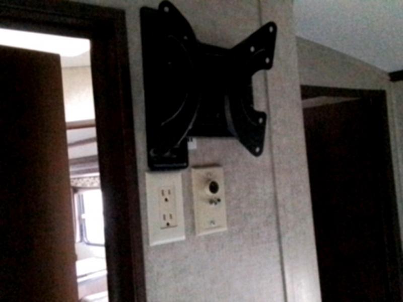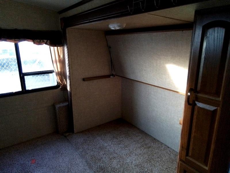 Inside the bunkhouse you will find a sofa sleeper with bunk above and wardrobe that are all part of the large living area slide. On the left side there is a second bunk above an entertainment center with storage.