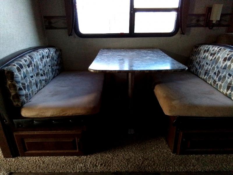 Opposite the door side is a sofa sleeper and booth dinette slide out. This slide actually continues into the rear bunkhouse behind a sliding pocket door.