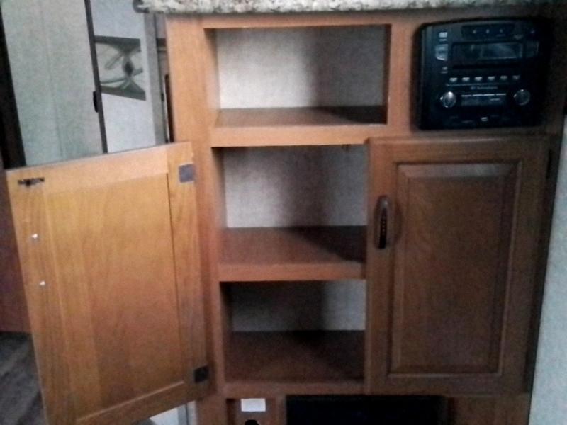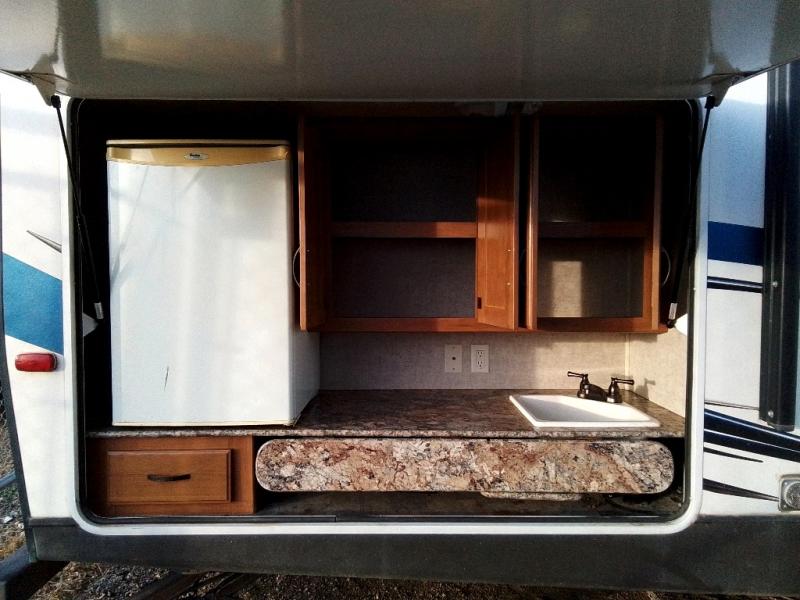 Before you enter notice the outside kitchen which is perfect for cooking and eating outside. There is a refrigerator, single kitchen sink, flip-out stove top, and bumper mount grill. You will also appreciate the storage that can be found in the front pass-through compartment.
