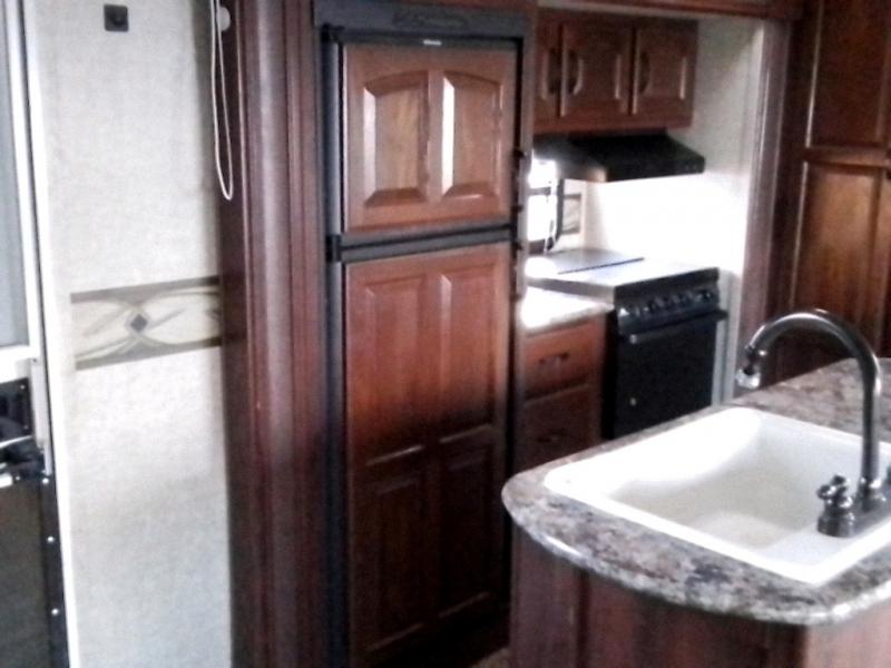 Next, step inside and be greeted by a spacious interior with a super large curbside slide and kitchen slide to the left of the door. There is an entertainment center to your immediate right as you enter. To the left find a refrigerator, and three burner range slide. A floor to ceiling double door pantry is located just off the slide. The kitchen island provides a bit more counter prep space, plus it is the location of the double kitchen sink.