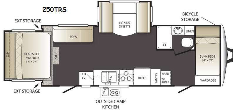 COMING SOONThis Outback Terrain Ultra Lite travel trailer 250TRS by Keystone features a set of bunks, a rear king bed slide, a king dinette, and an outside kitchen too!